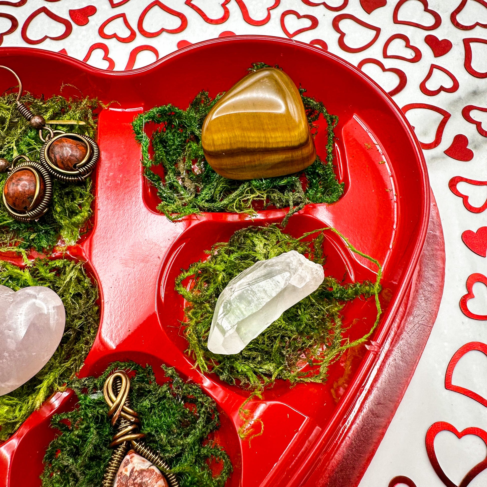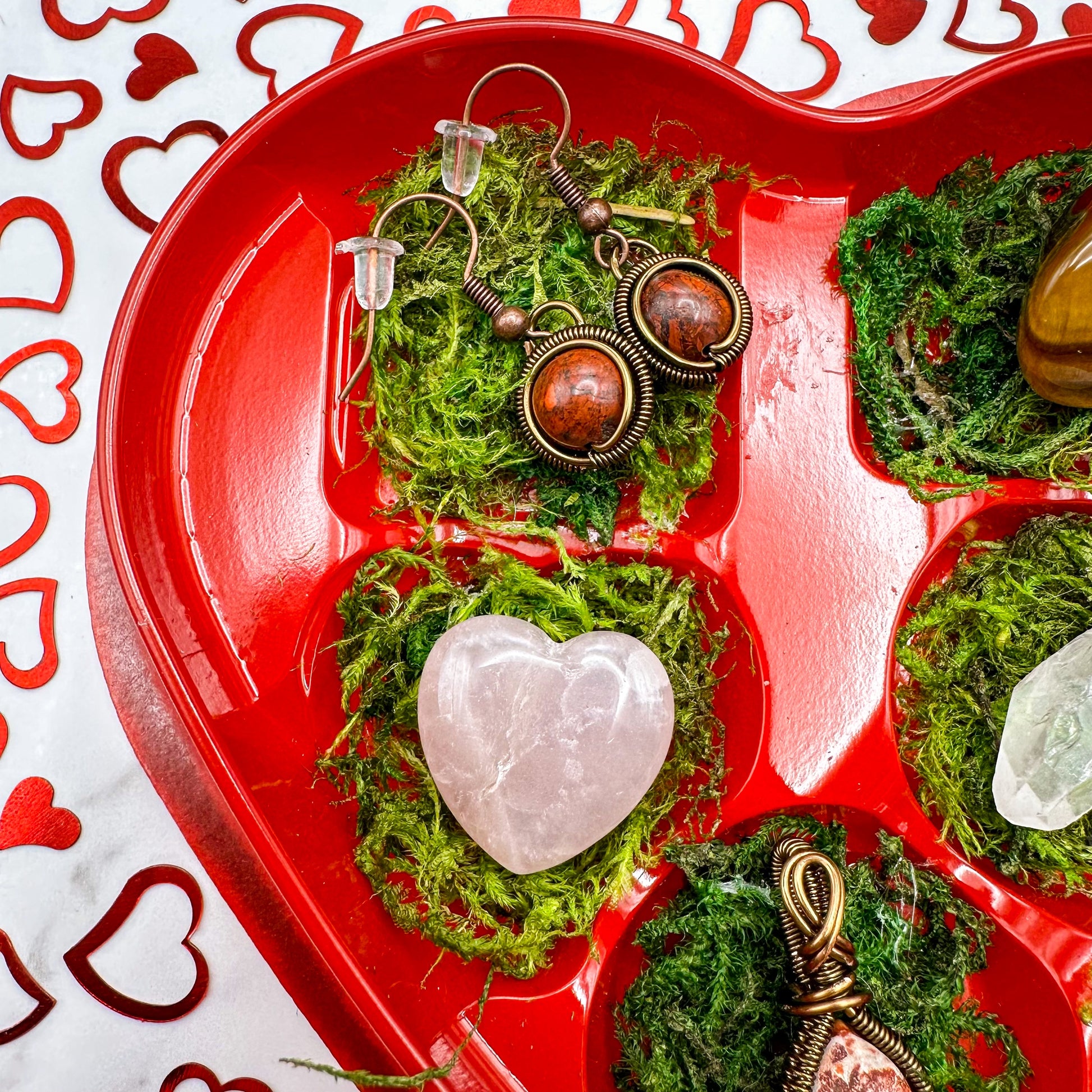 This heart box includes an antique brass plated rhodonite necklace and jasper earrings, a rose quartz heart, tigers eye, and quartz crystals.