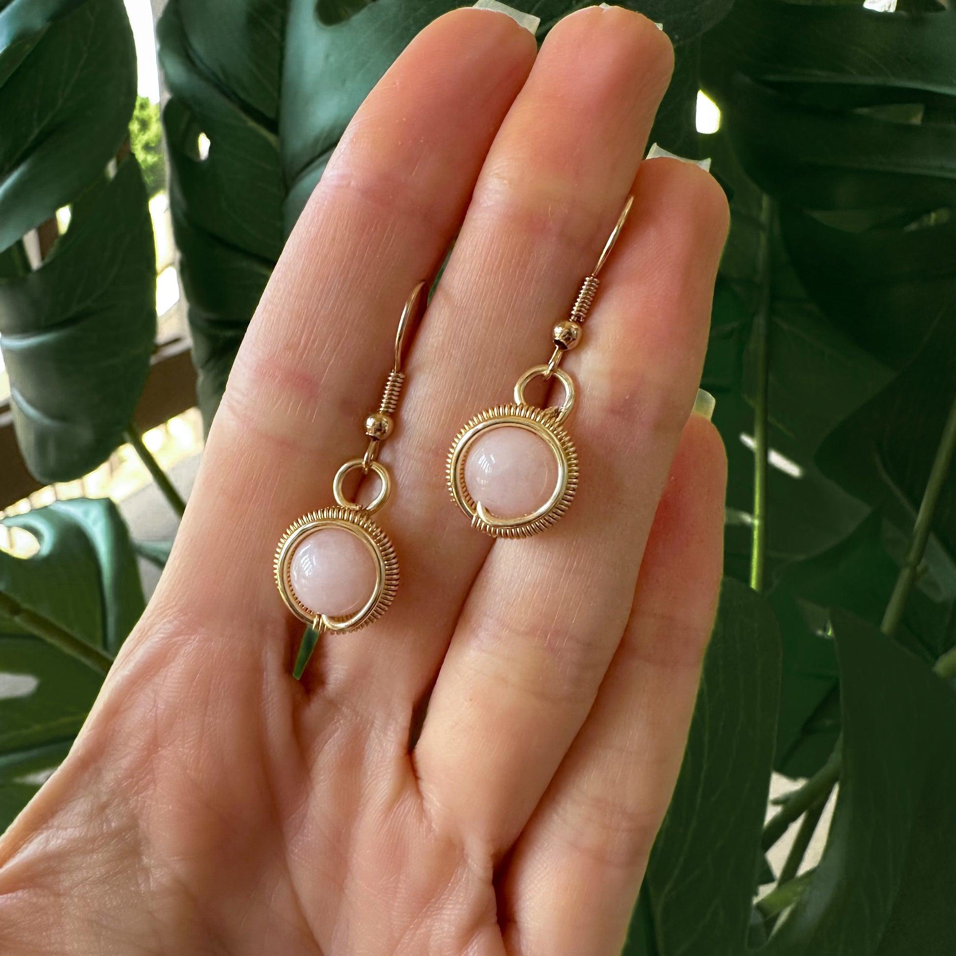 These handmade earrings are wire wrapped with your choice of antique brass or gold plated wire with rose quartz crystals.