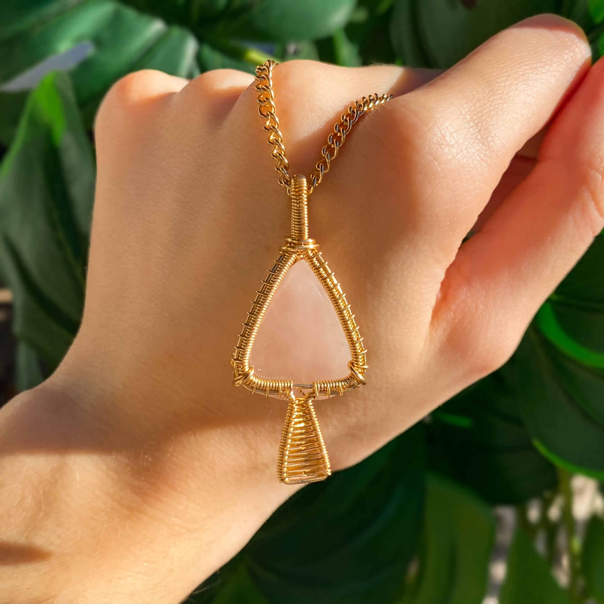 This rose quartz crystal is wire wrapped with gold plated wire in the shape of a mushroom.
