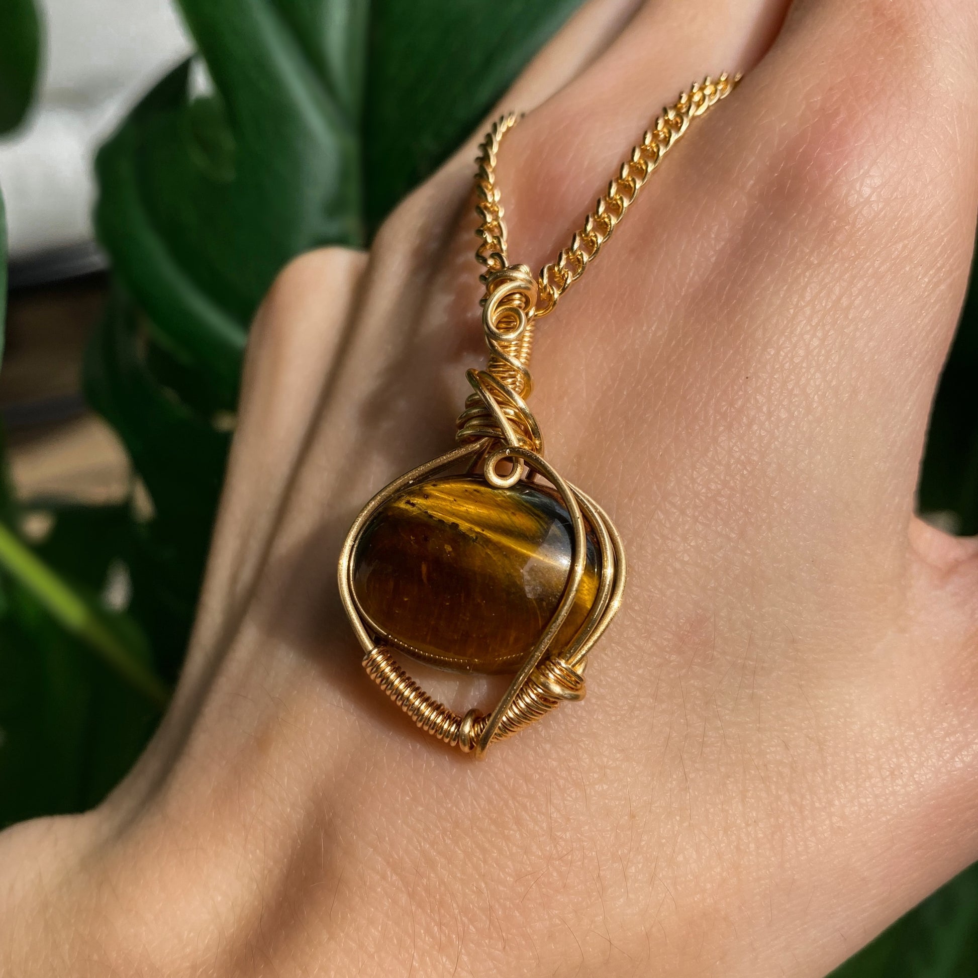 This handmade pendant has a tigers eye cabochon wire wrapped with gold copper filled wire.